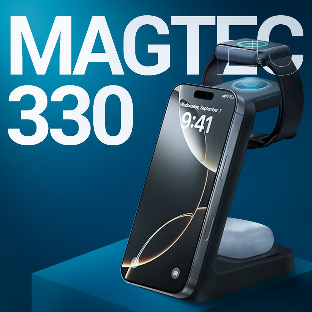 Magtec 330 is a magnetic 3‑in‑1 charging stand supporting 15 W magnetic fast charging for MagSafe-compatible iPhones, along with simultaneous charging for Apple Watch and AirPods (or other Qi earbuds including Galaxy Buds) in designated charging zones. It features a strong magnetic hold, flexible vertical/horizontal phone placement and IC-based protection for safe charging. Includes USB‑A to C and USB‑C to C cables; adapter not included. Compatible with iPhone 12–16 series, Apple Watch models, AirPods, and other Qi-enabled earbuds.