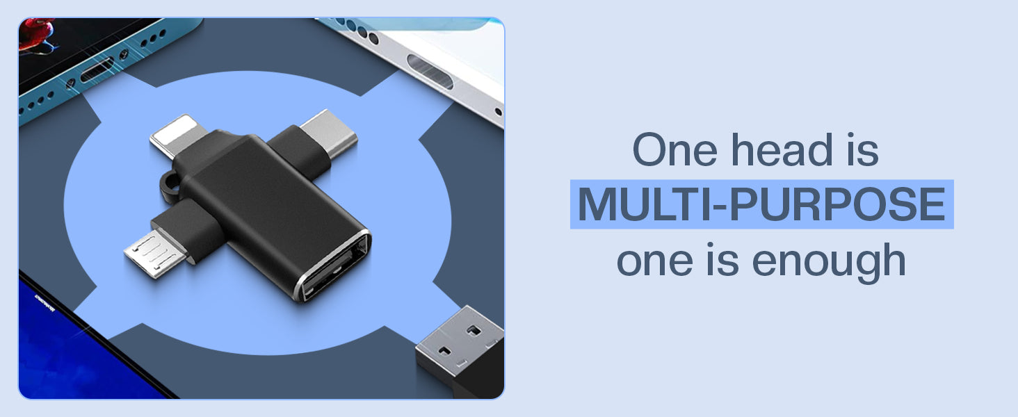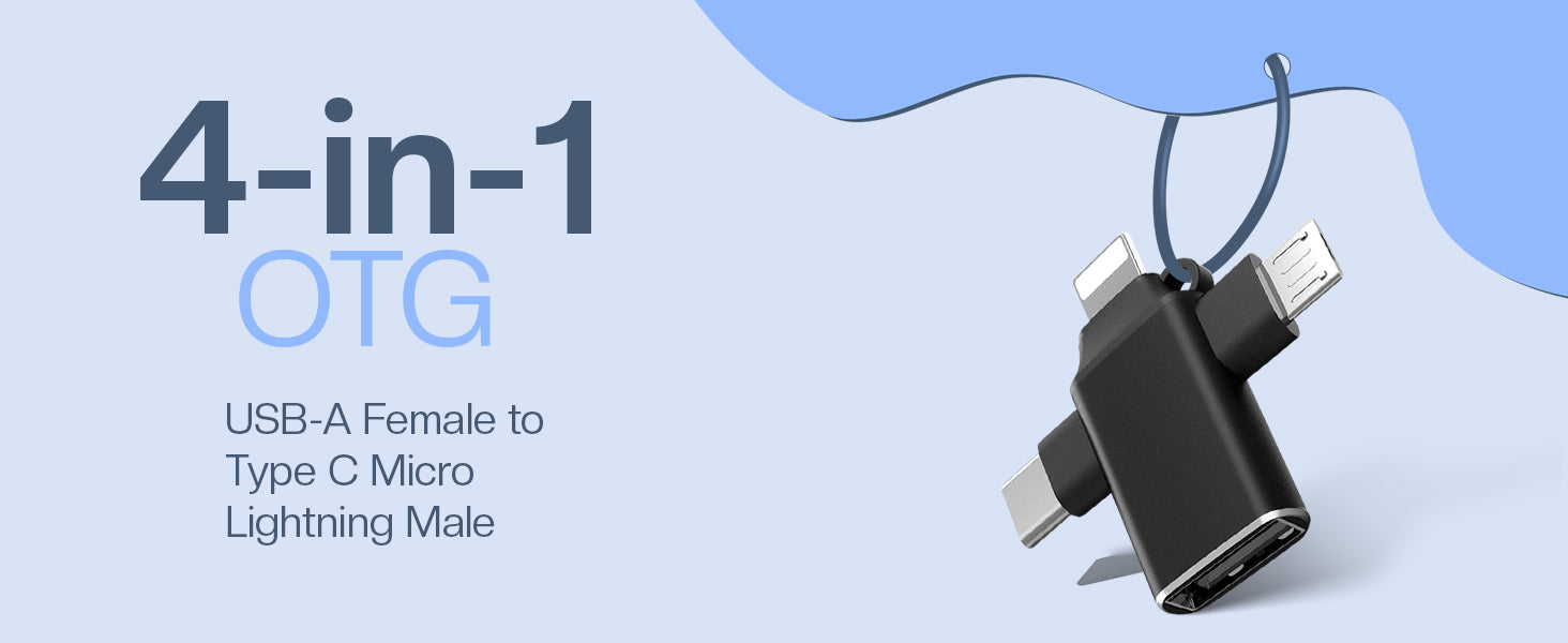 The adapter combines multiple interfaces — USB‑A (female) with available Type‑C, Micro USB, and Lightning connectors — so you can connect many different devices using one accessory.