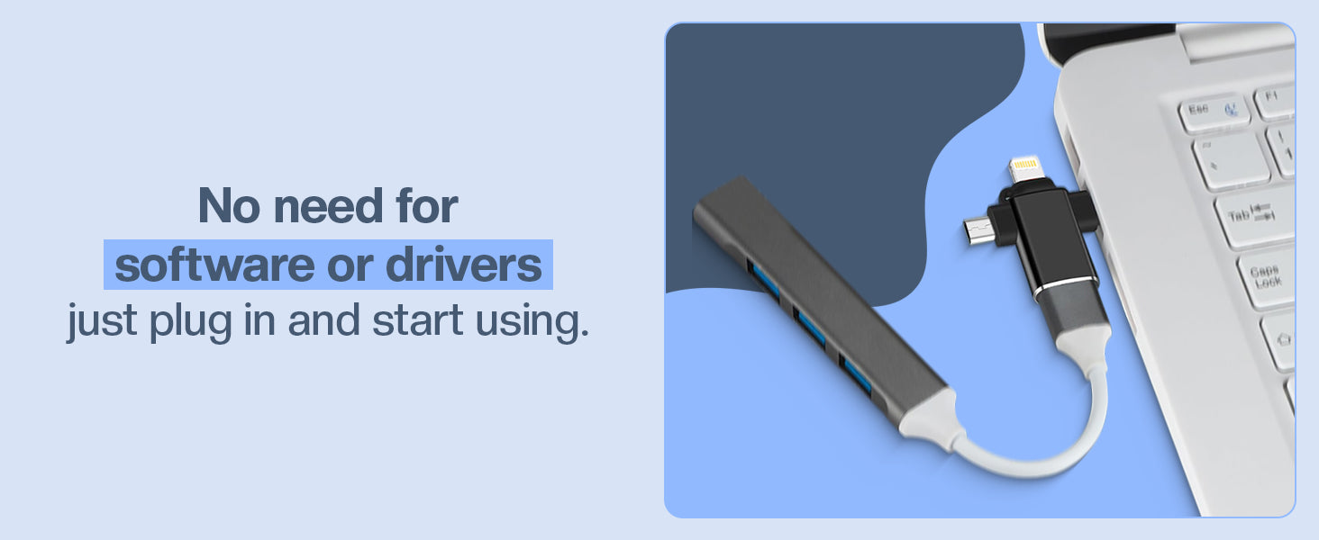 No — it works on a plug‑and‑play basis. Simply plug it into the supported device’s port and connect your USB accessory.