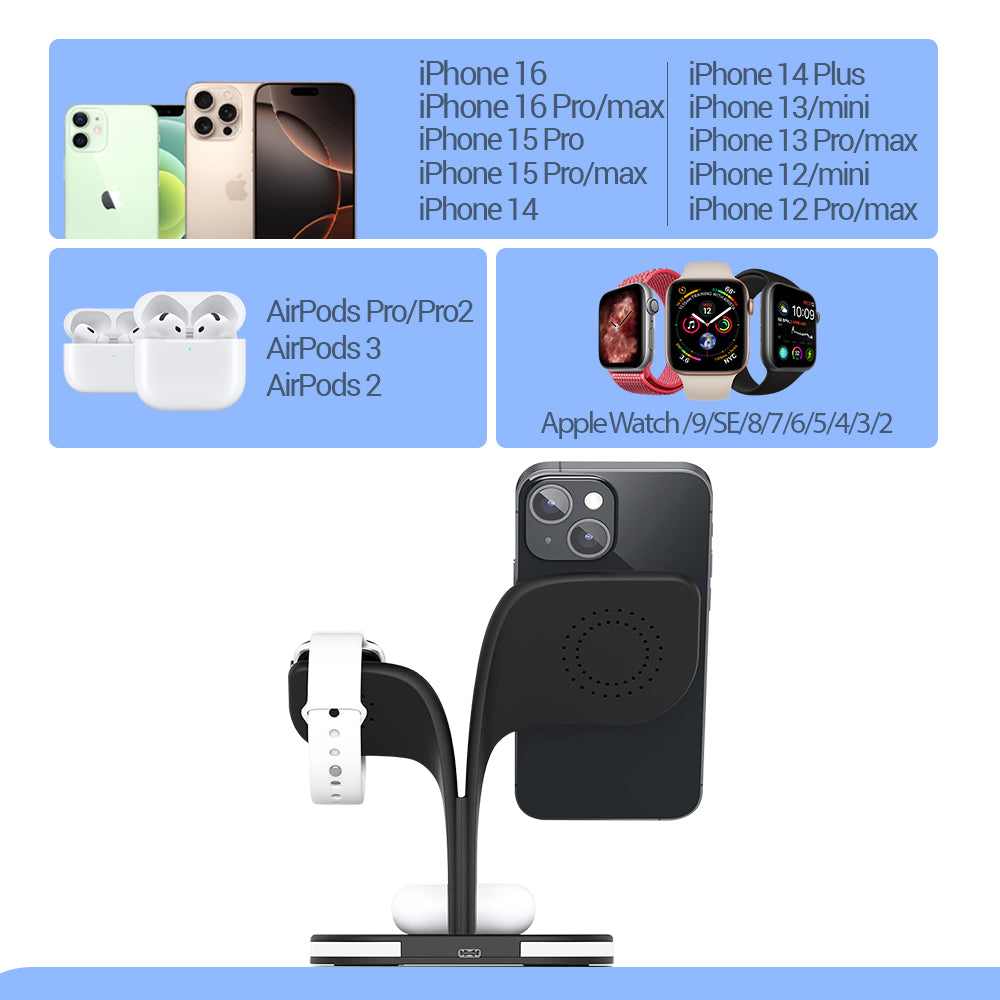 This wireless charger station is for iPhone 15, 14, 13, 13Pro, 13Pro Max, 12, iPhone 12 Pro, iPhone 12 mini, iPhone 12 Pro Max; for Apple Watch 2/3/4/5/6/7/8; for AirPods 2/3/Pro. Besides, 5W earphone plate of this wireless charging stand is also compatible with earphones like Galaxy Buds and Liberty Air, or other Qi-certified phones.
