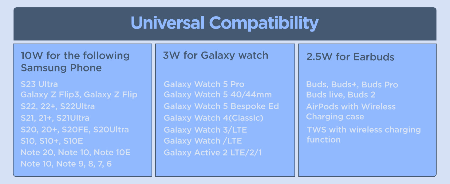 It supports Qi‑enabled smartphones, Apple Watch models, Galaxy Watches (5/4/3/Active), AirPods (2nd/3rd gen, Pro), and most other Qi wireless earbuds. This makes it compatible with many Android and iPhone devices.