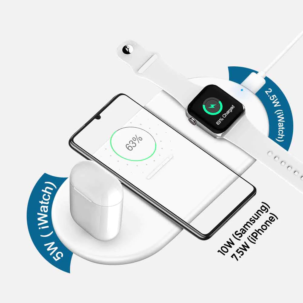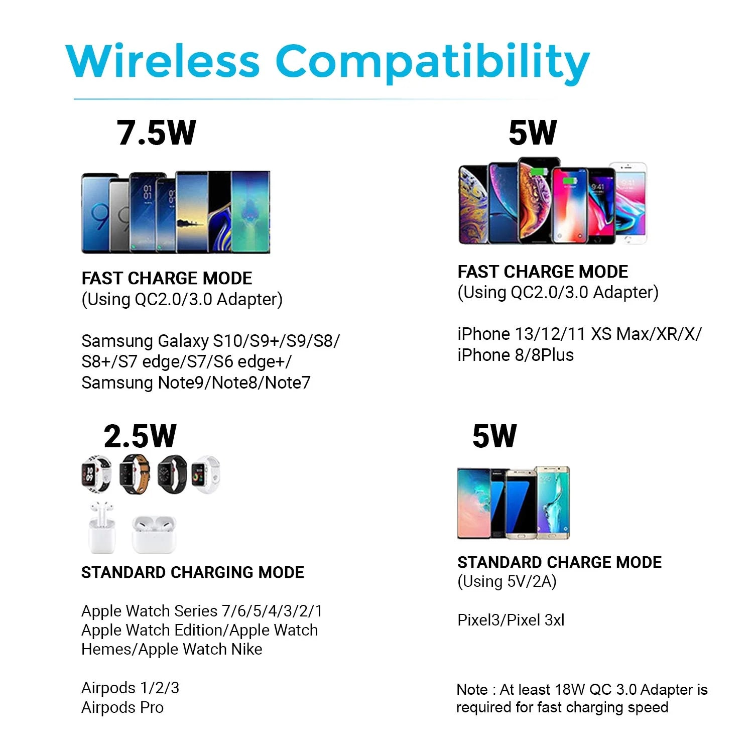 UNIDOCK 310 is built with 3 charging coils for different products to be charged together, providing charging output of 2.5W for iWatch, 5W for Airpods 1/2/3/Pro, 5W/7.5W/10W/15W for iPhone 13/12/11/XS/X/8 series and other Qi-enabled devices.