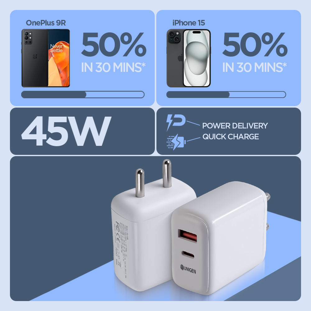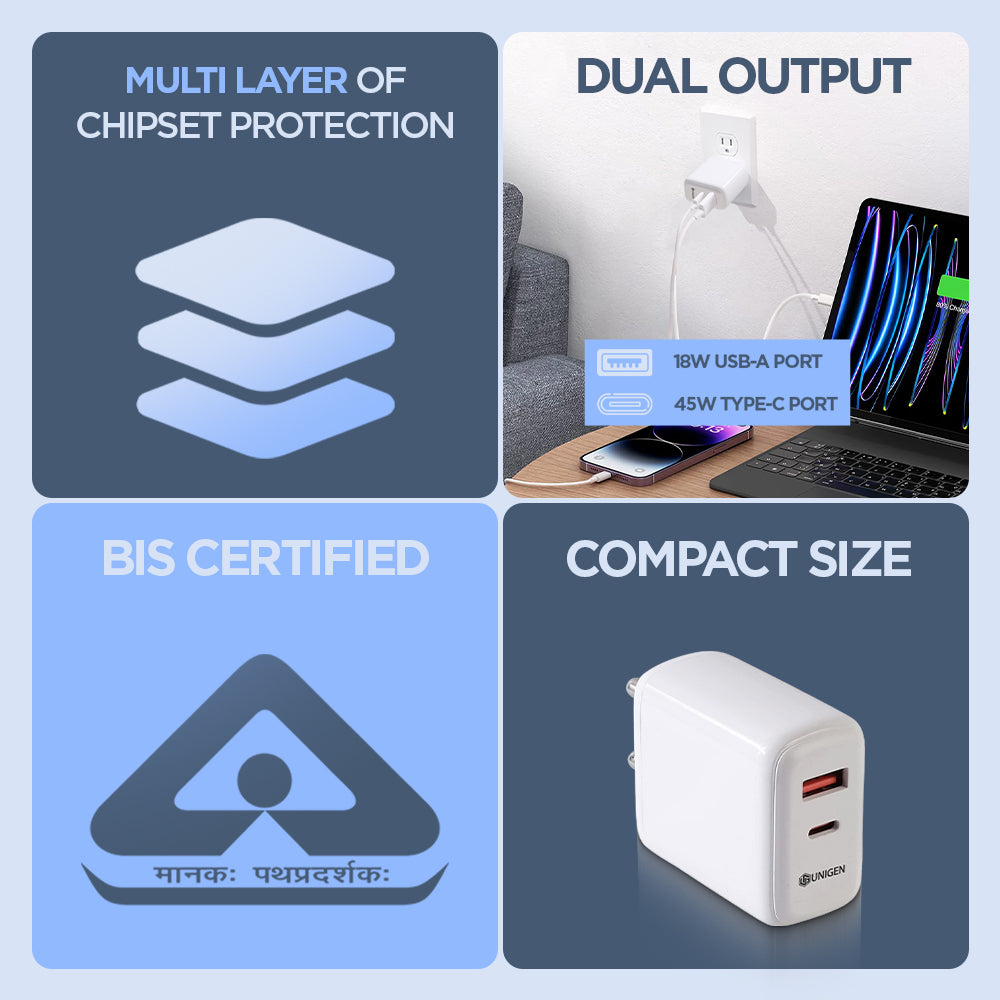 The UNIGEN 45W USB-C + USB-A Wall Charger is a compact power adapter that comes with dual ports for fast charging. It is compatible with all smartphones, tablets, and smartwatches. The charger is made of ABS material, making it lightweight and easy to carry around. With a total output of 45W, you can charge two devices simultaneously and quickly. Overall, it's a convenient and efficient charging solution for all your devices.