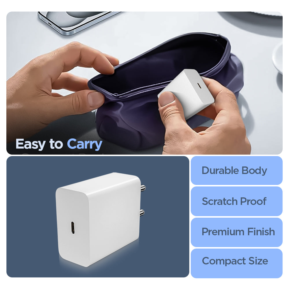 The chargerโ€™s small, lightweight body makes it easy to carry in bags, pouches, or pockets. Ideal for use at home, in the office, or while traveling, it fits perfectly into tight spaces and power strips without blocking other outlets.