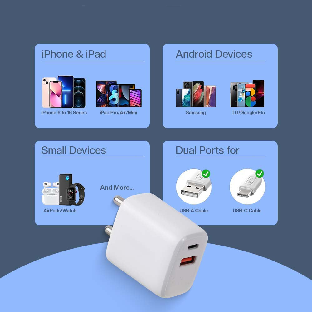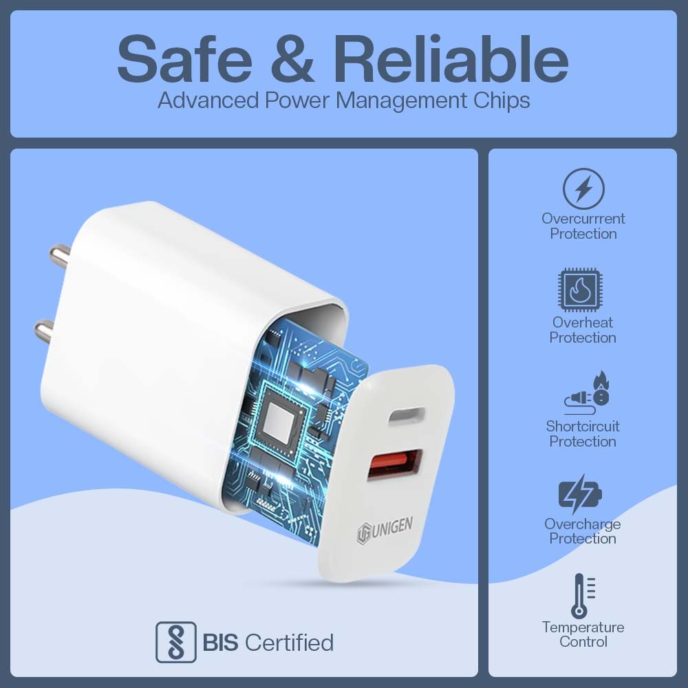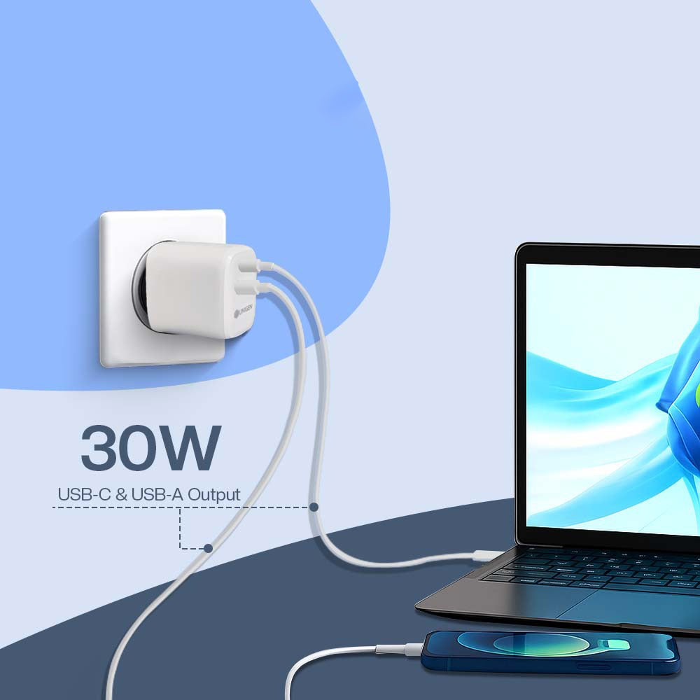 The UNIGEN 30W Dual USB-A + USB-C Wall Charger is a compact power adapter designed for fast charging smartphones, tablets, and smartwatches. It features both USB-A and USB-C ports and is made of durable ABS material. Despite its small size, it is a powerful adapter that can efficiently charge multiple devices at once.