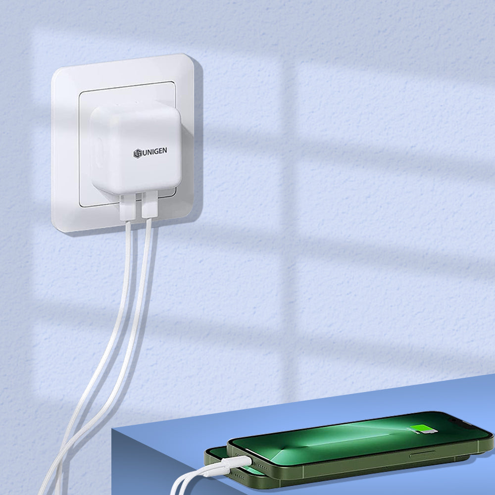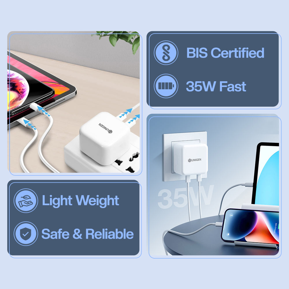 The UNIGEN 35W Dual USB-C Port Compact Power Adapter is a fast wall charger block designed for a range of Apple devices, including iPhone 14, 13, 12, 11, 14 Pro Max Plus Mini, iPad, Air Pods, and Mac Book Air. With PD 3.0 USB Type-C ports, this charger can quickly charge your devices, allowing you to stay connected and powered up wherever you go. Its small size and round shape make it easy to carry in your bag or pocket, and the ABS material used in its construction ensures durability and longevity.