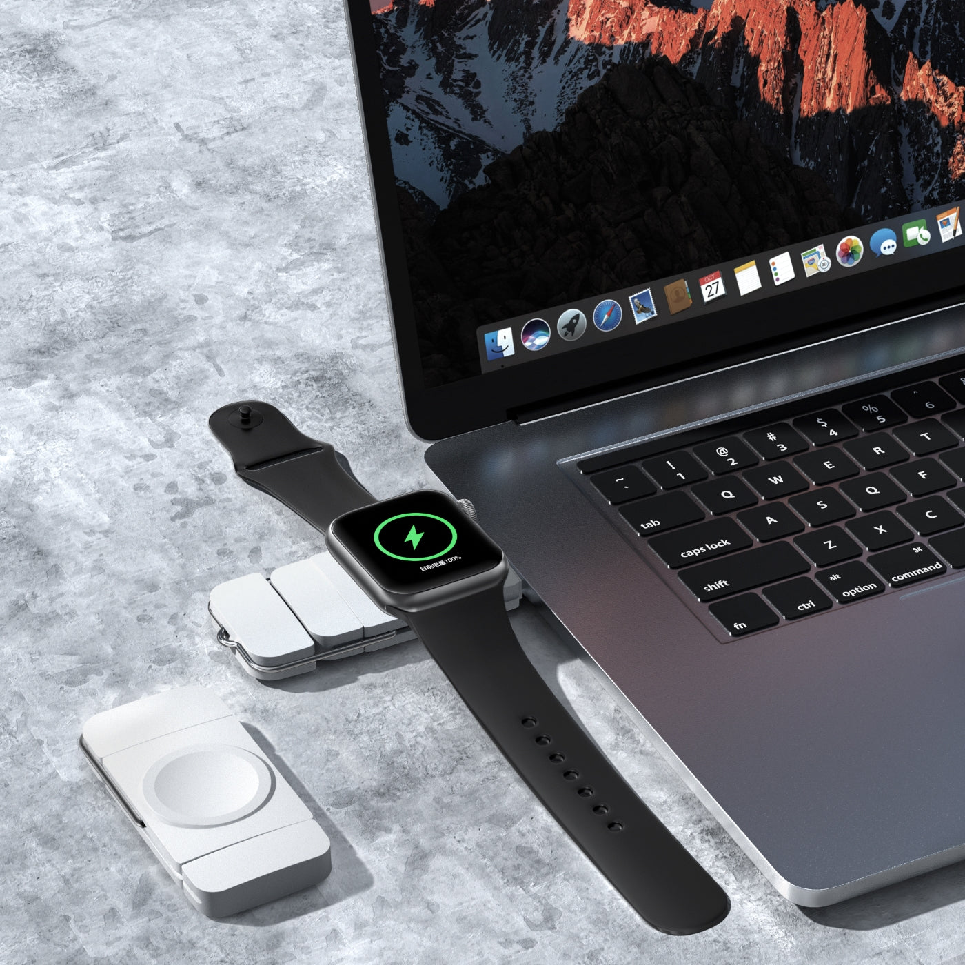 Introducing the UNIGEN UNIPORT Magnetic Watch Portable Charger with both USB C and USB A ports, designed to work with A-pple Watch Series Ultra 9, 8, 7, SE, 6, 5, 4, 3, 2, and 1. This charger is available in an elegant white finish.